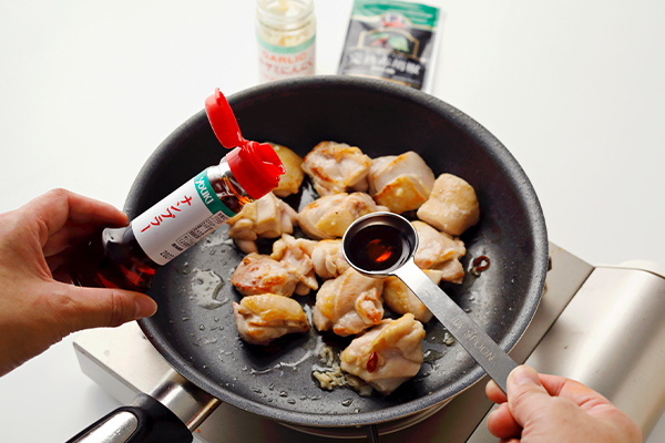 - フライパンにサラダ油を弱めの中火で熱し、にんにく、唐がらしを入れて炒める。香りが立ったら❶の鶏肉を並べ入れて3分ほど焼き、裏返してさらに2分ほど焼く。中火にして〈A〉の材料を加え、汁気がなくなるまで全体にからめる。