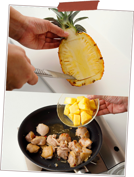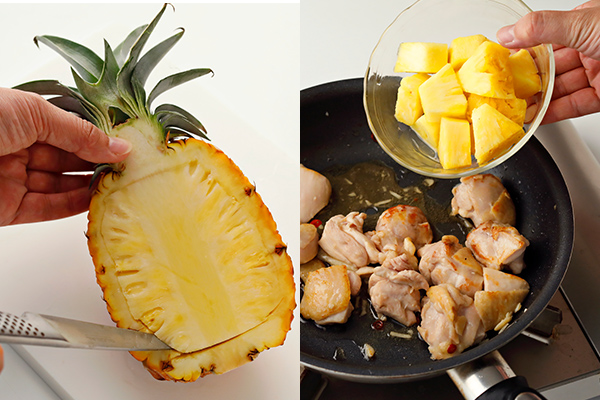 - パイナップルはペティーナイフなどで皮から1㎝ほど内側のところに一周、ぐるりと切り込みを入れてくりぬく(皮はとっておく)。しんを取り、一口大に切る(正味150g)。鶏肉は一口大に切る。