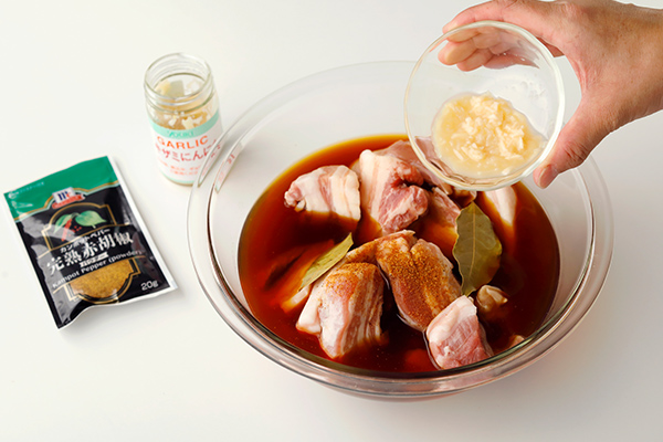 - ボールに〈A〉の材料を入れ、混ぜ合わせる。❶の豚肉、鶏肉を加えて混ぜ、にんにく、ベイリーブスを加えて全体を混ぜる。冷蔵庫に入れ、3~4時間おく。
