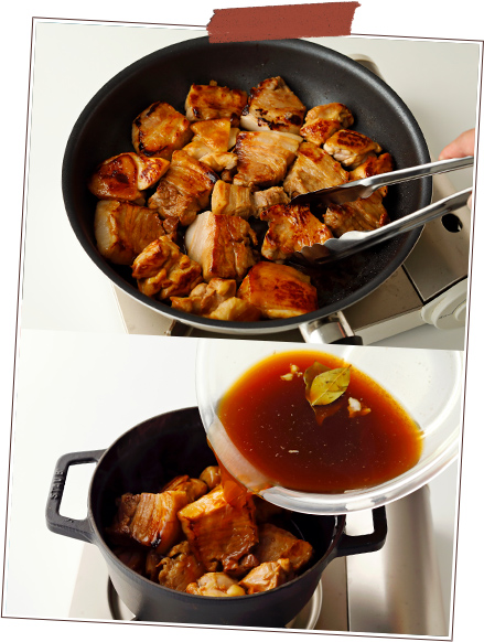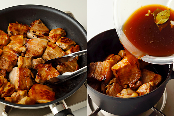 - 豚肉、鶏肉は汁気をきる(漬け汁はとっておく)。フライパンにサラダ油を強めの中火で熱し、豚肉、鶏肉を並べ入れる。途中返しながら、全体に焼き色がつくまで3~4分焼く(焦げやすいので、様子をみながら火を加減する)。
