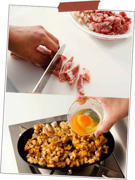 その2つの名のとおり、刻んだ肉を油で炒めてから、酢やしょうゆで味つけをします。