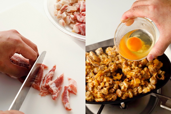※鉄板がなければ、❷でフライパンに入れたまま2か所をくぼませて、卵を流し入れる。