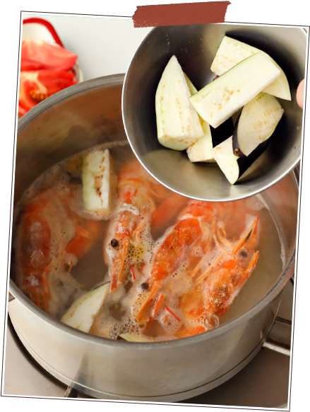 - 鍋に米のとぎ汁を入れて中火にかけ、煮立ったらえび、なすを加える。再び煮立ったら弱火にし、2~3分煮る。