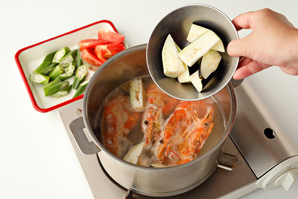 - オクラ、トマトを加え、さらに1〜2分煮る。〈A〉の材料を加えて全体を混ぜ、ひと煮立ちさせる。