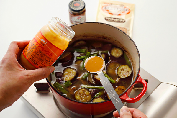 - フライパンにサラダ油を中火で熱し、にんにくと、❷のなす、さやいんげんを入れる。しんなりとするまで2分ほど炒め、❶の鍋に加えて、さらに5分ほど煮る。