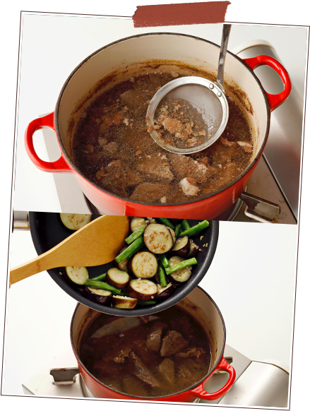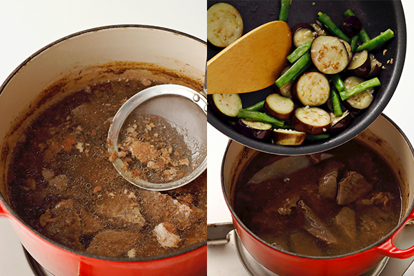 - 鍋に牛肉を入れて〈A〉の材料を加え、強めの中火にかける。煮立ったらアクを取って弱火にし、30~40分煮る。