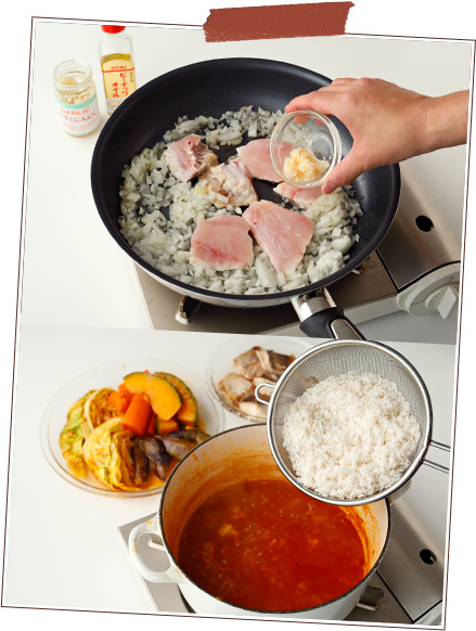 - 野菜を取り出し、煮汁に水を足して約2カップにする。米を加えてざっと混ぜ、中火にかける。煮立ったら弱火にしてふたをし、10分ほど炊く(途中、汁気が少なくなってきたら水適量を加える)。
