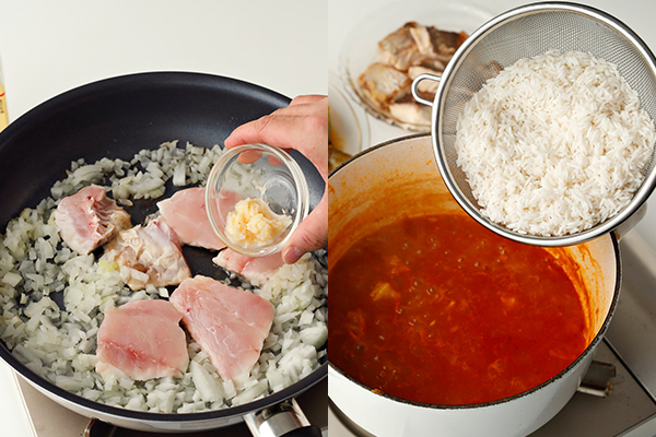 - フライパンにピーナッツオイルを中火で熱し、白身魚を皮目を下にして並べ入れ、2分ほど焼く。玉ねぎ、にんにくを加え、途中魚を返しながら、玉ねぎがしんなりとするまで2〜3分炒め、魚だけをバットなどに取り出す。
