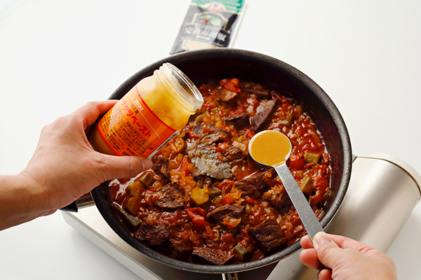 - カットトマトを入れてさっと炒め、〈A〉の材料を加えて混ぜる。煮立ったら弱火にし、ときどき混ぜながら30分ほど煮る。