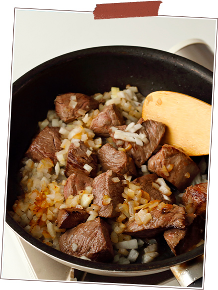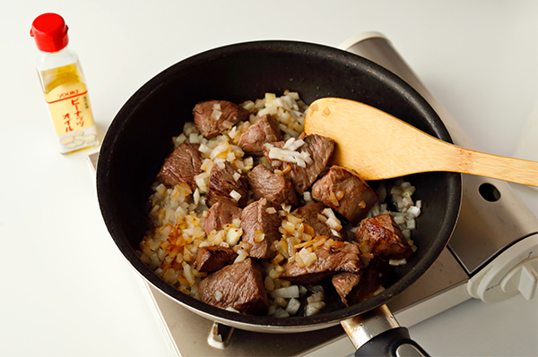 - フライパンにピーナッツオイルを中火で熱し、牛肉を入れて2〜3分炒める。焼き色がついたら玉ねぎを加え、さらに3分ほど炒める。