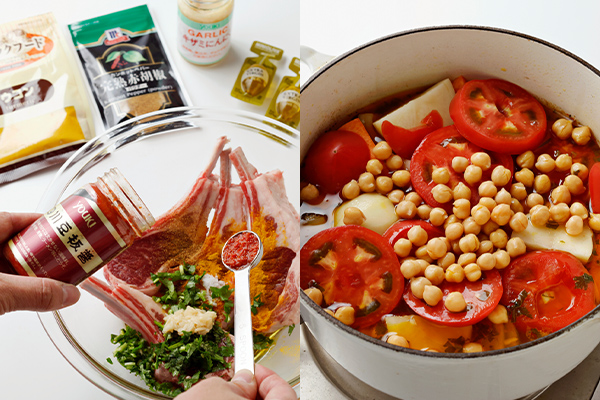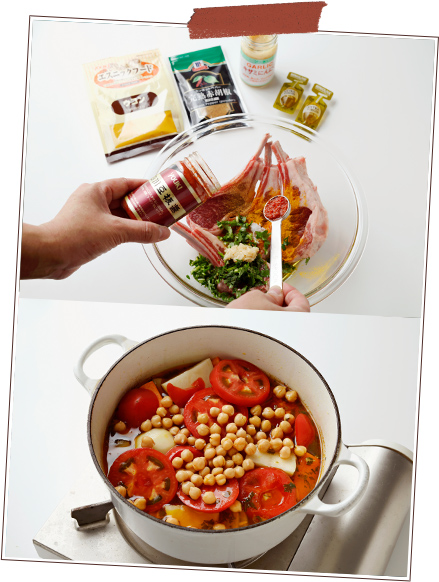 - ❷の鍋に❸とひよこ豆を加えて強火にし、煮立ったら弱めの中火にしてさらに10分ほど煮る。味をみて、塩少々、赤胡椒でととのえる。